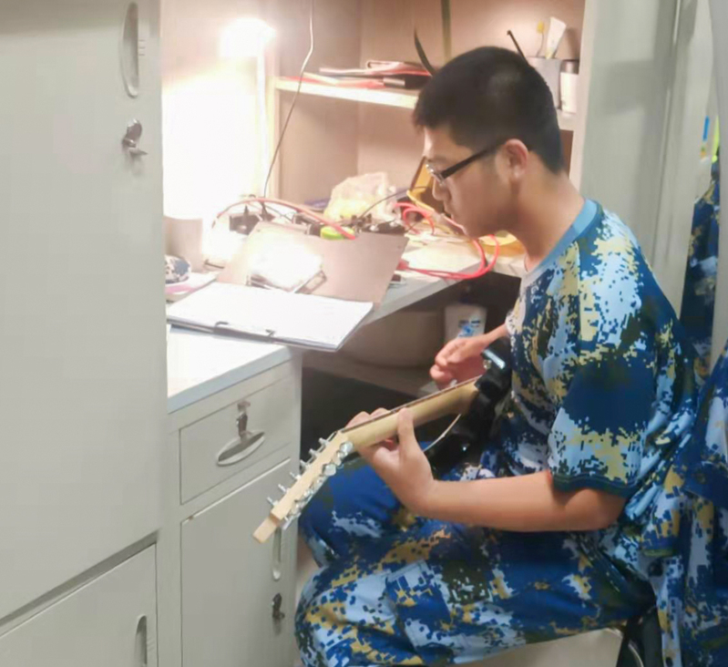 在查寝过程中遇到正在练习吉他的学生,给前来查寝的老师带来即兴表演。