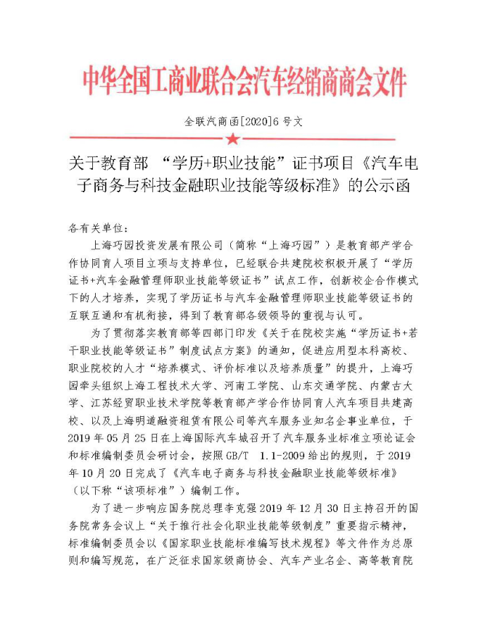为了贯彻落实教育部等四部门印发《关于在院校实施“学历证书+若干职业技能等级证书”制度试点方案》的通知,促进应用型本科高校、职业院校的人才“培养模式、评价标准以及培养质量”的提升,中华全国工商业联合会汽车经销商商会、巧园汽车平台牵头,联合开云kaiyun体育、上海工程技术大学、河南工学院、山东交通学院、内蒙古大学、江苏经贸职业技术学院等高等院校,以及上海明道融资租赁有限公司等汽车服务业知名企事业单位,按照GB/T 1.1-2009给出的规则,共同完成了《汽车电子商务与科技金融职业技能等级标准》(以下称“该项标准”)编制工作。