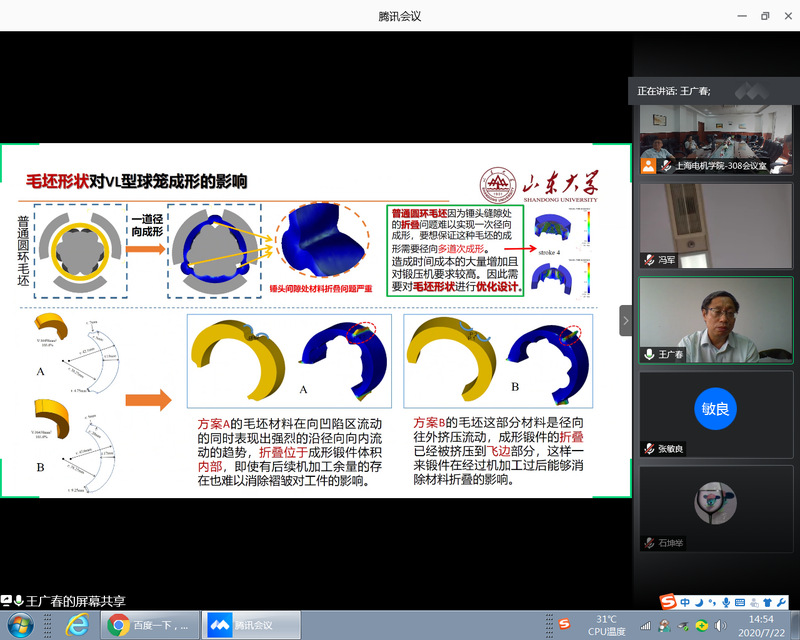 会上,辛教授介绍了专家组成员、立项背景及会议流程。中期检查专家组组长薛克敏教授组织了各个项目的中期检查工作。先后进行了“大锻件晶粒细化新工艺研究”等3项预研基金项目和“多向模锻液压机本体新结构研究”等2项开放基金项目的中期答辩。待项目答辩结束后,各位专家组成员分别对各项目答辩情况给出了意见,一致认为所立的5个项目研究内容符合高原学科发展要求且与实际工程相结合,希望项目团队再进行一定深入研究,发表一批高水平文章,形成具有知识产权的新技术。其中“超大直径环件智能热锻设备开发研究”项目技术基本成熟且联系重大工程实际,具有一定的应用发展前景。项目中期评审结束后,辛教授与三位专家进行了交流,分别征询了对5个项目的意见和对高原学科建设的建议。最后,辛教授进行了会议总结,并代表学科向与会专家表示感谢!