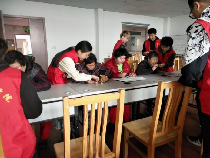 午饭之后,下午1点,志愿者们与老人展开了“一对一教学”活动,与他们一起搭积木,教他们写书法,给他们表演节目,每个人脸上都洋溢着幸福的笑容。大家一起合唱了“精忠报国”、“最炫民族风”等经典曲目。