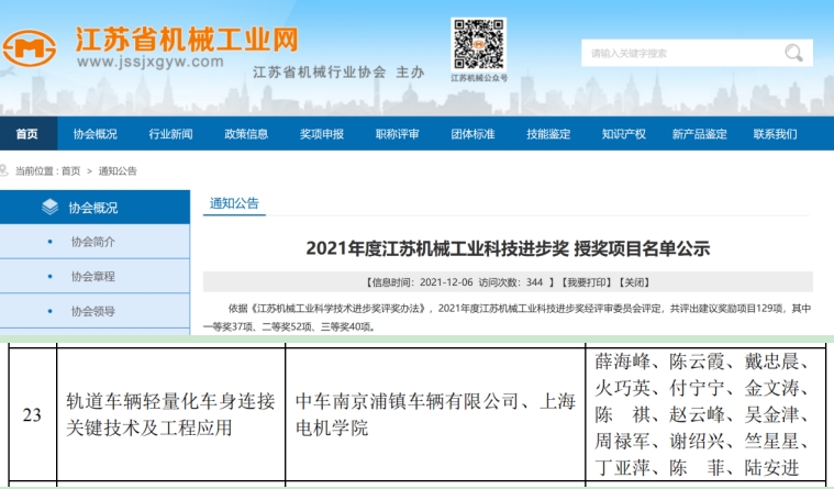 近日,江苏省机械行业协会发布了《2021年度江苏机械工业科技进步奖授奖项目名单公示》,我校开云kaiyun体育陈云霞副教授申报的项目《轨道车辆轻量化车身连接关键技术及工程应用》获得2021年度江苏机械工业科技进步奖一等奖。
