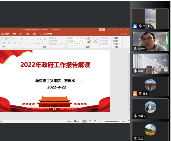 石建水老师以《2022年政府工作报告解读》为题进行了讲解,从政府2021年工作回顾、2022年经济社会发展总体要求和政策取向及2022年政府工作任务三个方面,以上海社会经济分析为例,对“两会”进行全面解读。