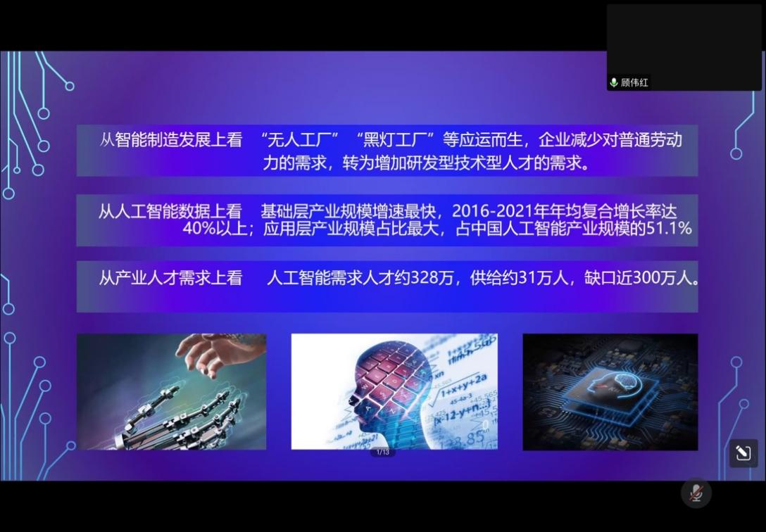 讲座中,她提到一名合格的智能制造人才需要具备创新精神、工匠精神、数字化思维以及交互协同能力。通过对智能制造发展、人工智能数据、产业人才需求三个方面的解读分析,顾书记得出了现如今国内智能制造行业发展迅速、研发型人才需求增大、人工智能需求人才缺口大等现实问题。随着讲解的层层深入,同学们也在心中埋下了参与到我国智能制造发展中去的种子。