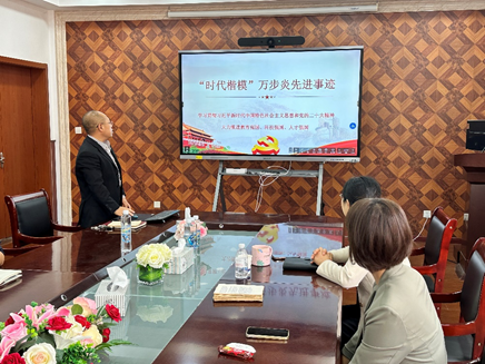 会议伊始,大家观看了万步炎先进事迹短片。万步炎是湖南科技大学二级教授、博士生导师,第十四届全国人大代表, “时代楷模”称号获得者。短片中展示了他一步步攀登学术高峰的奋斗历程,令在场的每个人备受鼓舞。万步炎先生在自己的研究领域取得了一系列重要突破,其爱国热忱更是值得学习。