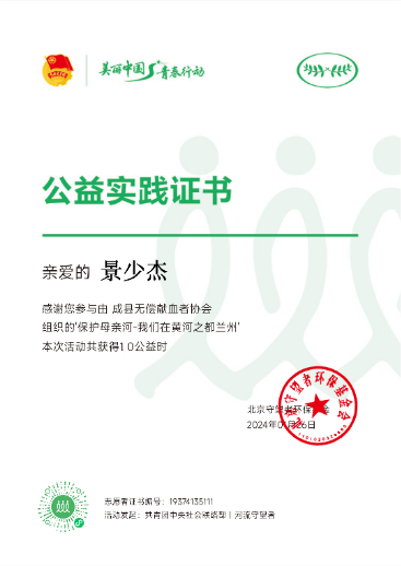 景少杰同志参加了由成县无偿献血者协会组织的“保护母亲河-我们在黄河之都兰州”志愿活动。