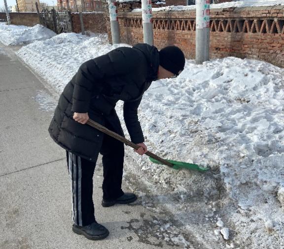 闫月照在家乡面对连续三天三夜的持续降雪,造成路面大雪堆积,给村民的出行带来了极度的不方便的情况下,积极参加积雪清扫志愿服务活动,对各街道进行分组进行打扫,把道路积雪进行统一集中处理,在路面挤压的积雪进行铲除。