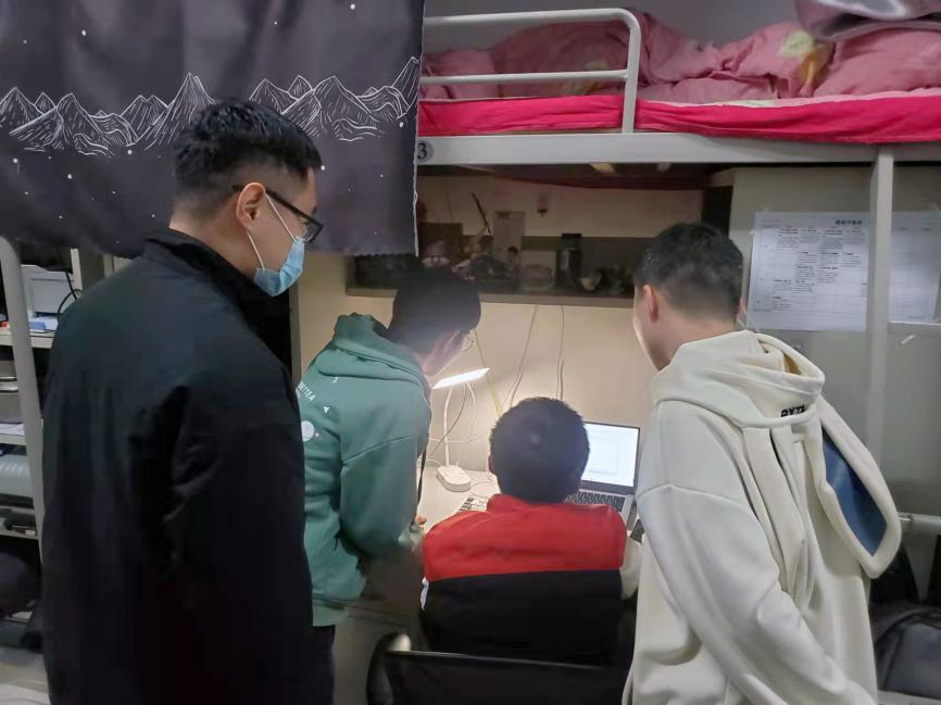 走进学生宿舍、了解准封闭期间同学生活、学习情况。发现毕业班的同学积极准备论文答辩、考研的同学认真复习功课,部分同学在学习高数教学视频;有的同学在做作业、学软件(UG);另外还有同学交流考研规划等。