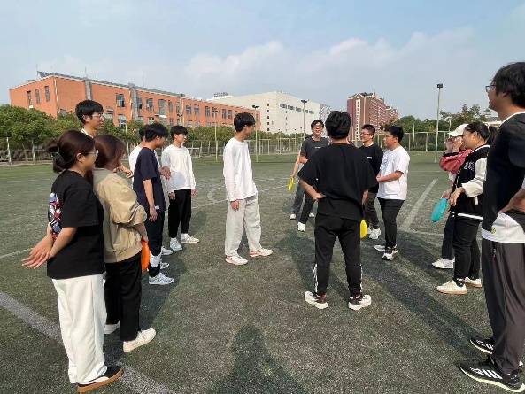 在足球场上,飞盘社的同学给我们作了详细的讲解,教同学们如何扔出飞盘和用何种哪种手势去接飞盘,并制定了比赛规则,以7人为小组进行团体赛。同学们听的认真,玩的认真,在一飞一接中逐渐熟悉了规则并且培养了手感。