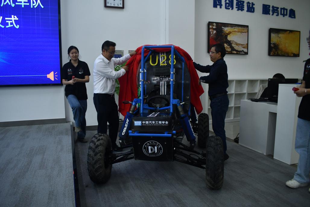 仪式开始,刘军院长首先向莅临现场的各位领导与嘉宾致以热烈的欢迎,并简要地阐述了本次活动的重要意义。王宏志副校长和付晓刚主任共同为新车U28揭开帷幕,一辆设计新颖、技术先进的巴哈赛车U28在众人的热切期盼中惊艳亮相。随后,车队队长王爽为大家介绍了本赛季新车设计理念、技术亮点及团队在研发过程中的不懈努力与显著成果,展现了车队成员的创新精神与扎实技术。